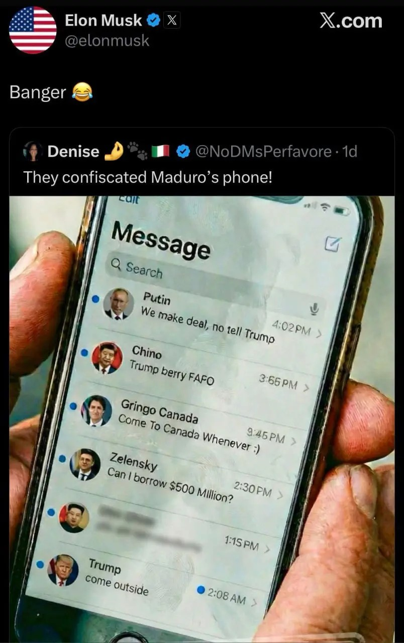 به گزارش بهداشت نیوز، ایلان ماسک یک شوخی درباره تلفن مادورو را «بازنشر» کرد، جایی که رهبران مختلف جهان در حال انجام معامله با او نشان داده شدهاند.