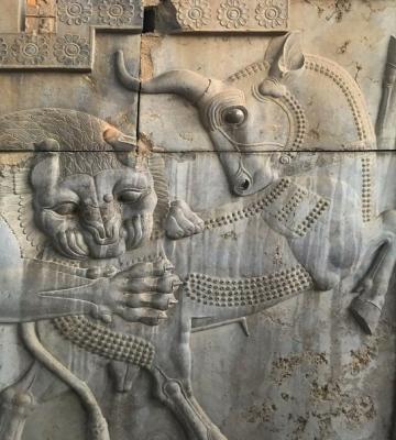 ادامه مطلباین سنگنگاره نبرد نمادینی میان شیر (نماد خورشید به عنوان روشنایی و گرمابخش) با گاو (نماد زمین) است و پیامآور نوروز محسوب میشود. عکاس: محمدجواد مرنضایی