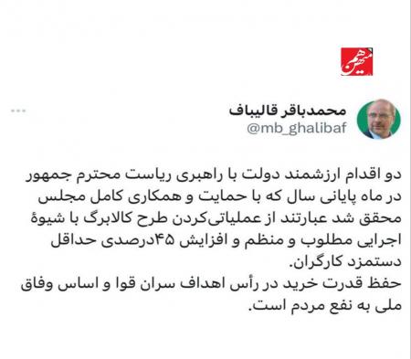 ادامه مطلبقالیباف از افزایش ۴۵درصدی حقوق کارگران حمایت کرد. رئیس مجلس در توییتر نوشت: دو اقدام ارزشمند دولت با راهبری رئیسجمهور و حمایت کامل مجلس محقق شد.