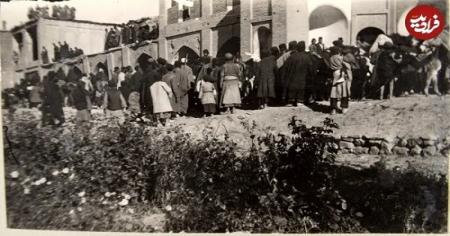 ادامه مطلبدر این عکس بیبی خاور با لباس سفید و در حالی که سوار بر اسب شده در انتهای سمت راست تصویر دیده میشود. جمعیت تماشاچیان و مهمانان حتی بر روی پشتبامهای اطراف نیز دیده میشوند.