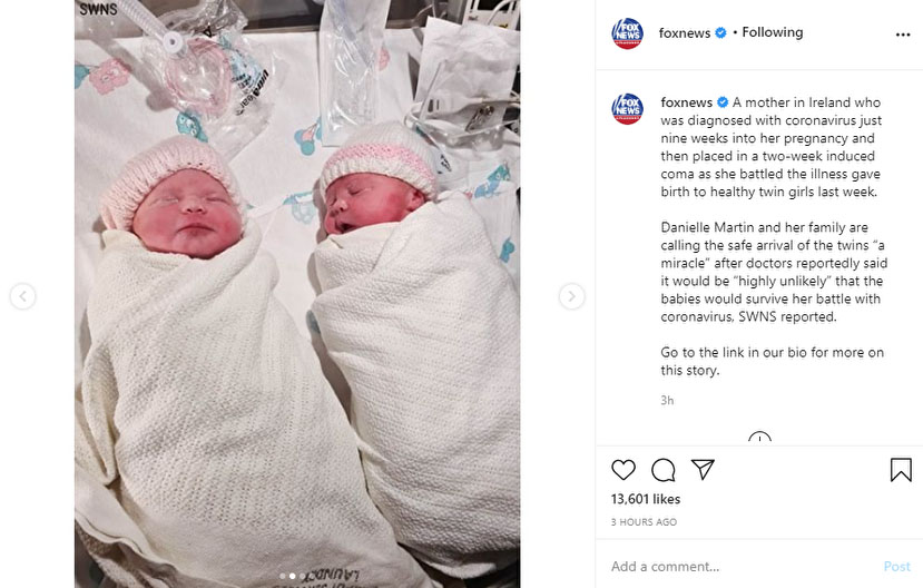 صفحه اینستاگرام «فاکس نیوز» نوشت: یک مادر ایرلندی تنها با گذشت ۹ هفته بارداری به بیماری کرونا مبتلا شد. این مادر با وجود اینکه دو هفته در کما قرار گرفت، توانست دوقلوهای خود را سالم به دنیا آورد.