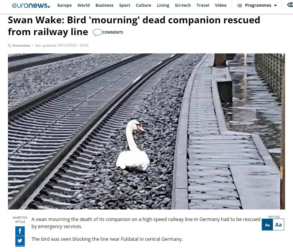 در آلمان یک قو که در حال سوگواری برای جفتش روی ریل قطار بوده باعث تاخیر در حرکت ۲۰ قطار شد. جفت این قو در برخورد با خطوط برق بالای ریل کشته شده بود. آواز قو و سوگواری بین قوها یه پدیده رایج است.