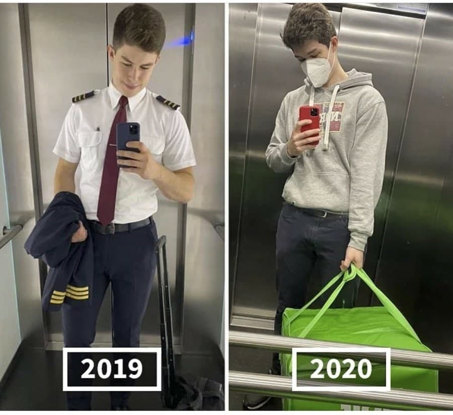این پسر سال ۲۰۱۹ خلبان بوده و تو خطوط هوایی لیتوانی کار میکرده سال ۲۰۲۰ به خاطر کرونا از کار بیکار میشه و به عنوان پیک غذا برای رستورانا کارش رو شروع میکنه این خودش خلاصهای از سالی که گذشت بود.