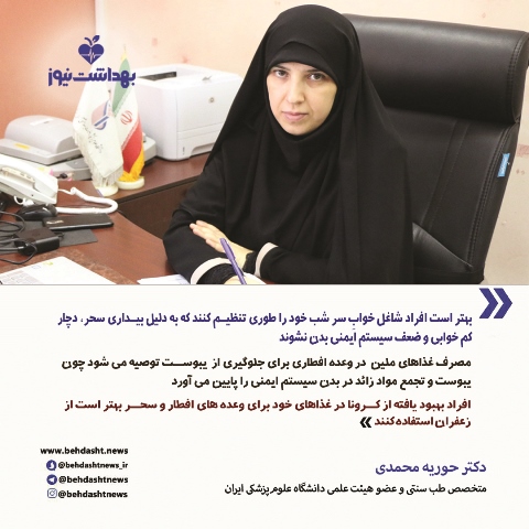 دکتر حوریه محمدی با بیان اینکه وضعیت خواب و ساعت کاری افراد شاغل در ماه مبارک رمضان دچار خدشه می شود و همین مسأله سیستم ایمنی بدن آن ها را ضعیف می کند، به خبرنگار بهداشت نیوز گفت: ما خواب روز را خیلی توصیه نمی کنیم به همین دلیل بهتر است این افراد با توجه به ساعت بیداری سحر، خوابِ سر شب خود را طوری تنظیم کنند که بتوانند 7 تا 8 ساعت خواب مفید داشته باشند.