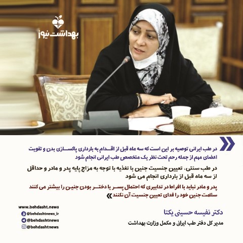 مدیر کل دفتر طب ایرانی و مکمل وزارت بهداشت تصریح کرد: از آنجایی که تجویز بسیاری از دمنوش ها و داروهای گیاهی در دوران بارداری مجاز نیست، در طب ایرانی توصیه بر این است که سه ماه قبل از اقدام به بارداری پاکسازی بدن و تقویت اعضای مهم از جمله رحم تحت نظر یک متخصص طب ایرانی انجام شود.