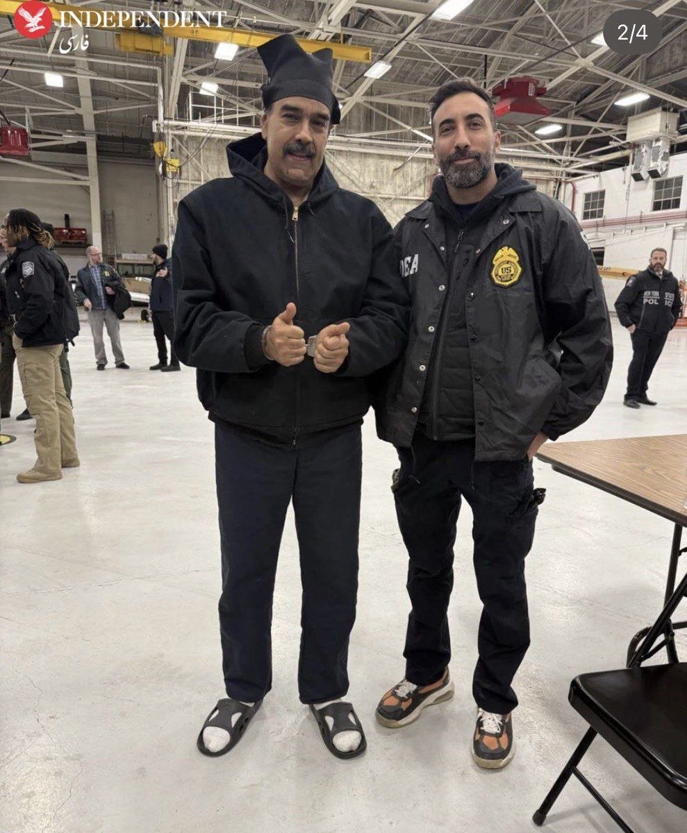 نیکلاس مادورو، رئیسجمهور ونزوئلا، پس از دستگیری و انتقال به آمریکا در صحنهای غیرمنتظره با ژست عجیب در کنار مأمور امنیتی دیده شد؛ تصویری که توجه رسانهها را به خود جلب کرده و همزمان با آغاز روند قضایی او در نیویورک منتشر شده است.