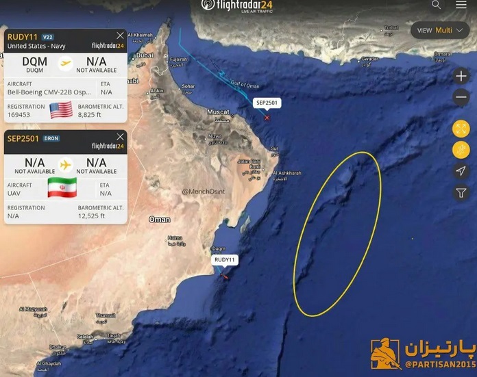 همزمان با گشتزنی پهپاد ایرانی به شناسه SEP۲۵۰۱ بر فراز دریایی عمان، تیلتروتورهای CMV-۲۲ Ospery مستقر در فوردگاه دوقم عمان که در طی روز های گذشته از ناو هواپیمابر لینکلن به این فرودگاه منتقل شده بودند، در حال بازگشت به سمت ناوگروه لینکلن هستند.