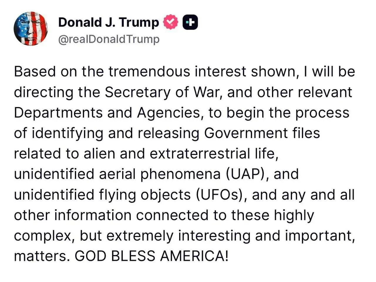 ترامپ در این خصوص نوشت «با توجه به علاقه گستردهای که نشان داده شده، به وزیر جنگ و سایر وزارتخانهها و نهادهای مرتبط دستور خواهم داد روند شناسایی و انتشار اسناد دولتی مرتبط با حیات بیگانه و فرازمینی، پدیدههای هوایی ناشناس (UAP) و اشیای پرنده ناشناس (UFO) را آغاز کنند.»